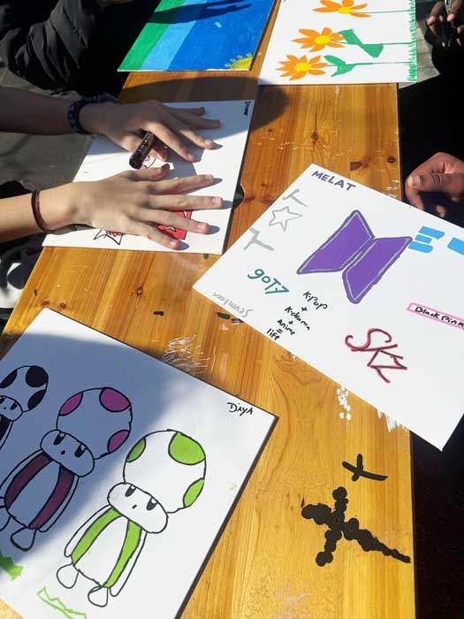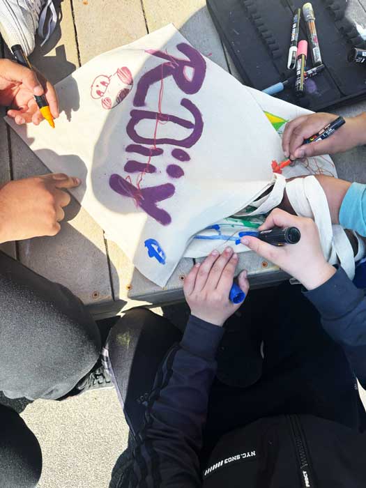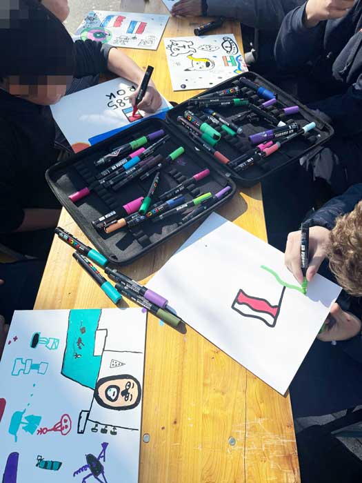 Tot slot konden de leerlingen ook individueel aan de slag: met graffiti-stiften versierden ze blanco linnen tassen. Namen, symbolen, patronen – alles kwam voorbij. De tassen waren niet alleen kleurrijk, maar ook een weerspiegeling van ieders persoonlijkheid.