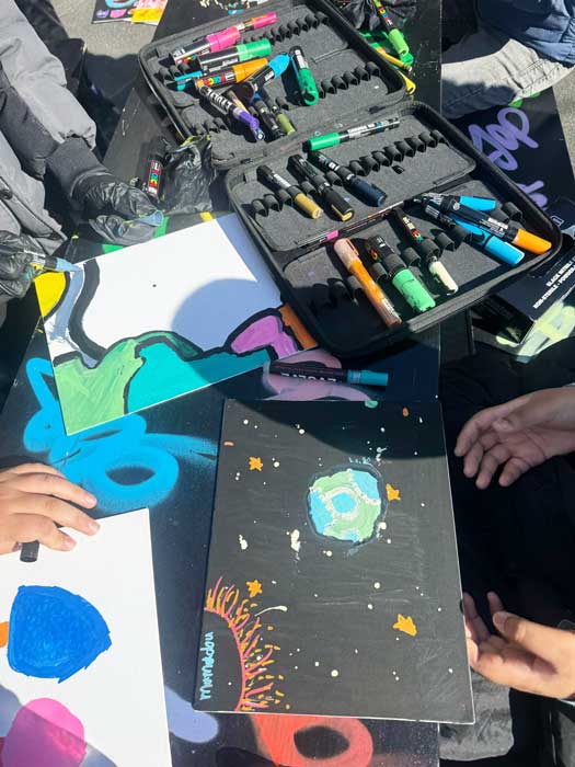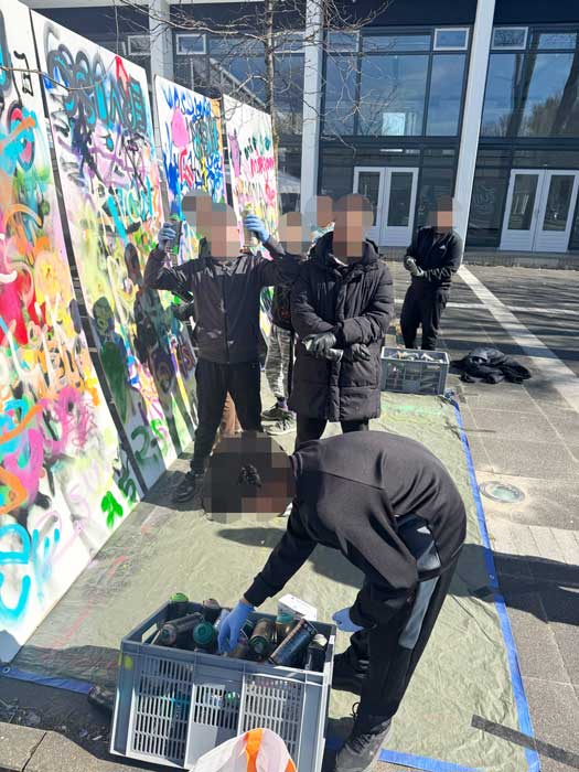 Buiten wachtte de volgende uitdaging: graffiti-art. In de frisse buitenlucht kregen de leerlingen de kans om samen een groot kunstwerk te spuiten op een reusachtige poster. Spuitbus in de hand, verbeelding op volle toeren – elke kleur, lijn en vorm droeg bij aan een uniek geheel. Dit kunstwerk krijgt binnenkort een vaste plek op school, als blijvende herinnering aan deze creatieve dag.